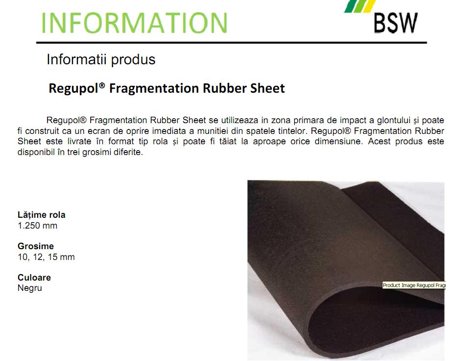 Regupol® Fragmentation Rubber Sheet este o foaie din cauciuc special fabricata la dimeniunea dorita, cu grosimea de 10, 12 sau 15 mm, care se pozitioneaza imediat dupa tinte si are rolul de prim impact cu munitia inainte de lovirea blocurilor de captare (Regupol® Shooting Blocks).